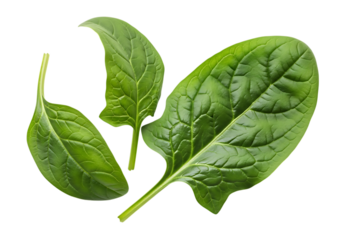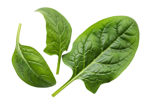 Three vibrant green spinach leaves floating against a pure transparent background, showcasing their distinct texture and shape isolated on transparent background