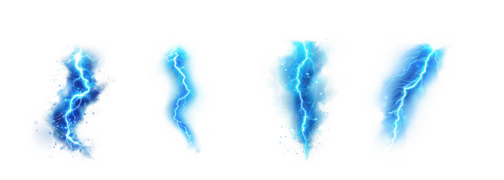 Four vibrant blue lightning bolt effects with wispy edges presented as digital elements on transparent background