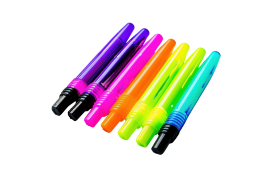Vibrant collection of neon highlighters arranged in a colorful display for creative note-taking isolated on transparent background