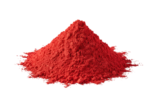 A sculptural mound of vibrant, finely milled scarlet red powder with velvety texture, precise 45-degree angle, on a seamless transparent background. Concept for product purity