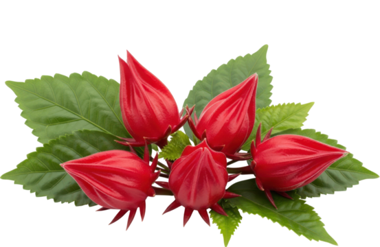 Five vibrant red roselle calyxes, also known as hibiscus sabdariffa or sorrel, clustered together with fresh green leaves, isolated on transparent background for culinary or medicinal use