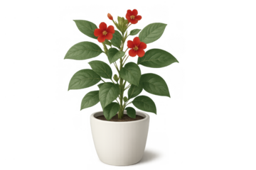 Potted red flower plant in white pot with green leaves, bringing spring and vibrant color indoors as a houseplant