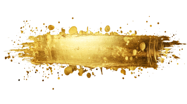 Gold paint brush stroke featuring vibrant splatters, isolated on a transparent background, creating a luxurious and elegant texture