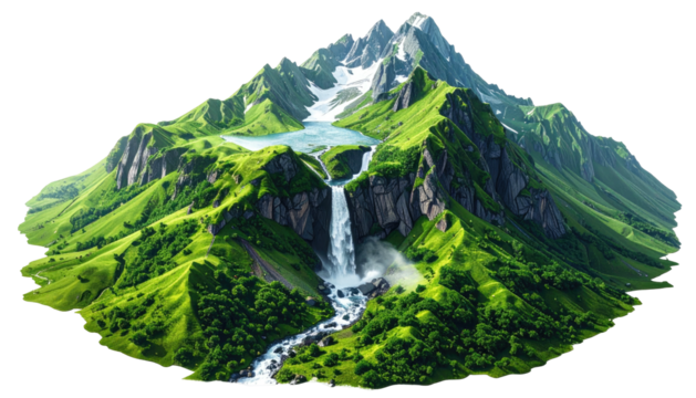 Miniature, vibrant island mountain vista with lush greenery, waterfalls, and a glacial lake