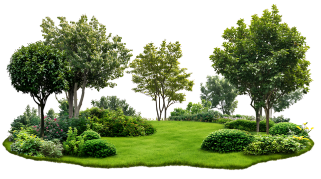 Lush garden island with trees bushes and green grass on transparent background