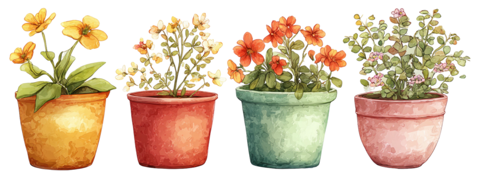 Hand-drawn watercolor elements: green trees, red flowers, grass, soil, stones, rocks, and wooden stumps, isolated on transparent, top-down view, concept for landscape planning design