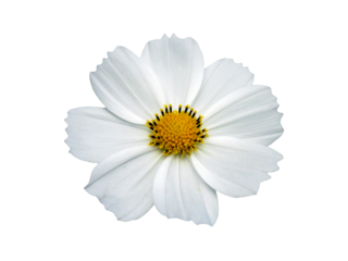 White cosmos flower with yellow center perfectly isolated on transparent background, png