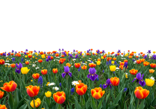 Colorful spring flowers bloom vibrantly in a beautiful garden field, presenting a rich tapestry of orange, yellow, and purple blossoms, creating a picturesque natural display.