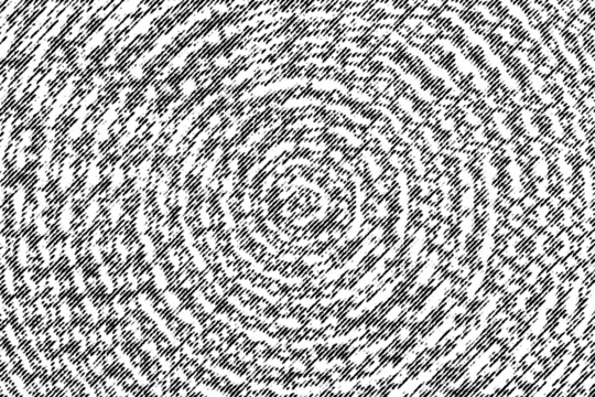 Macro halftone print of circular water-like ripples made from dense diagonal strokes in black on a transparent background, forming a vibrating wave pattern.