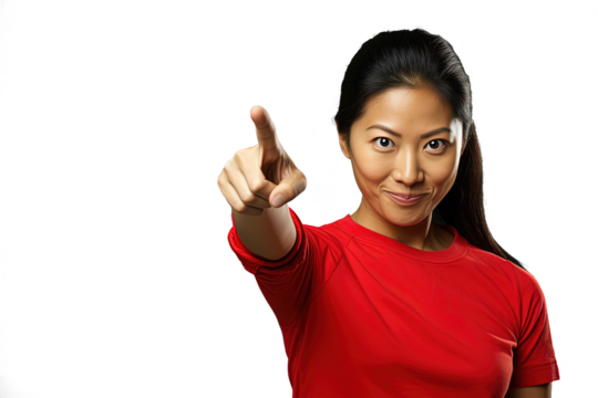 Portrait of a smiling woman with her index finger pointing up, isolated on transparent background