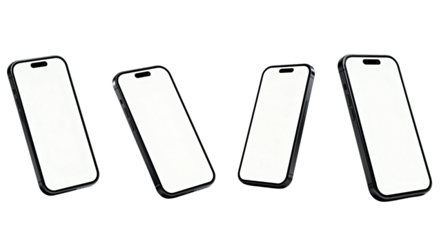 Four modern smartphones with blank white screens angled on a white background.