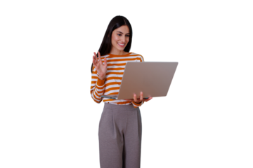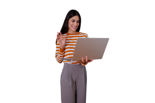 Smiling young woman using a digital tablet for virtual communication or online learning. isolated PNG with Transparent Background