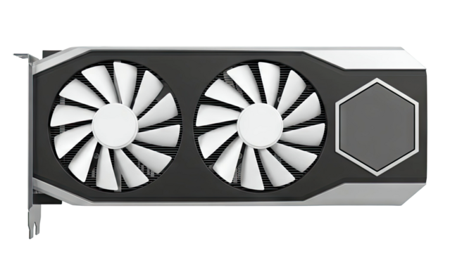 Modern black dualfan graphics card isolated on transparent background for computer hardware concept