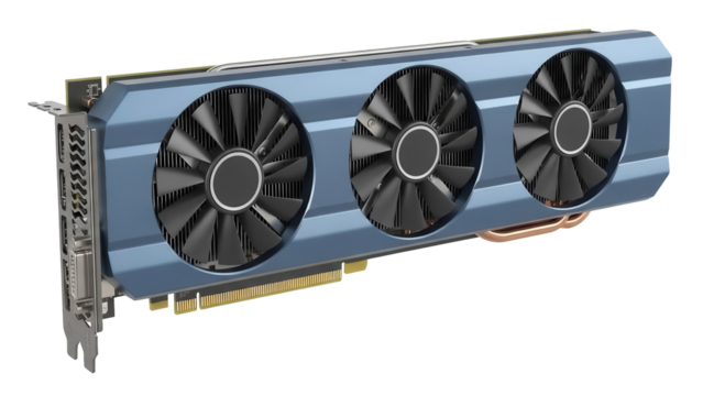 Blue and black graphics card isolated PNG on transparent background, computer hardware component for gaming and cryptocurrency mining