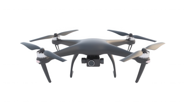A sleek black professional drone with a high-resolution camera for aerial photography and videography isolated on transparent background