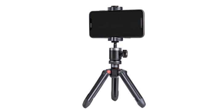 Compact mini tripod securely holding smartphone horizontally, showcasing stable mobile filming setup ideal for photography, videography, streaming and content creation on white background