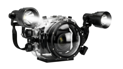 Professional underwater camera housing system with powerful illuminating dive lights for capturing stunning marine photography and videography during deep sea expeditions.