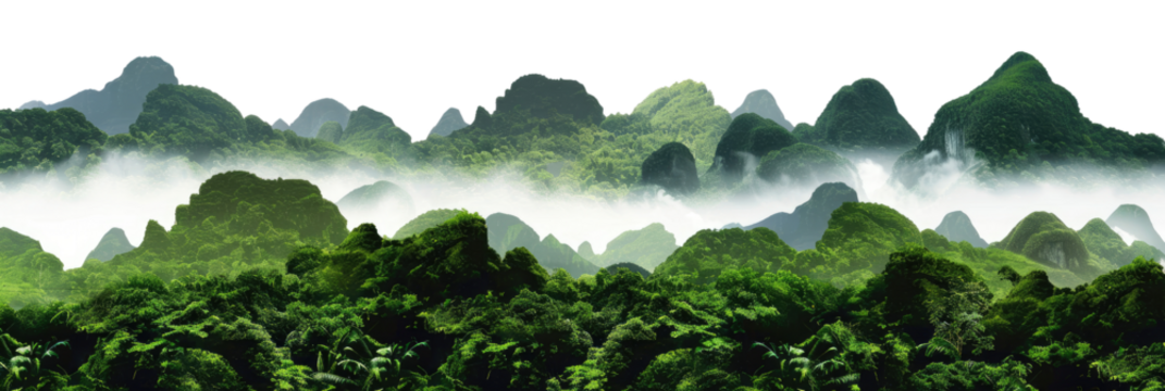 Green lush Amazon tropical rainforest jungle with towering hills landscape with misty mountains at dawn cut out, isolated, transparent background - PNG.