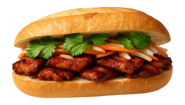 Delicious Vietnamese Banh Mi Sandwich with Pork and Fresh Herbs Isolate on Transparent Background, cutout, png