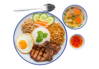 Vietnamese broken rice dish with grilled pork chop, fried egg, and side soup, isolated on transparent background