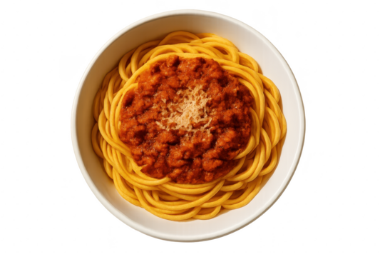 A top-down view of spaghetti with meat sauce, basil, and cheese in a white bowl