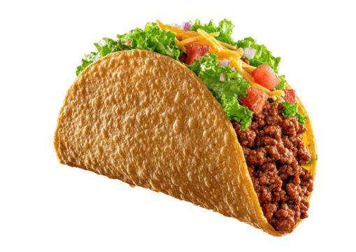 Side view of a taco.  Crispy corn tortilla filled with seasoned ground beef, lettuce, diced tomatoes, and shredded cheese.  Fresh ingredients, prepared and ready to eat