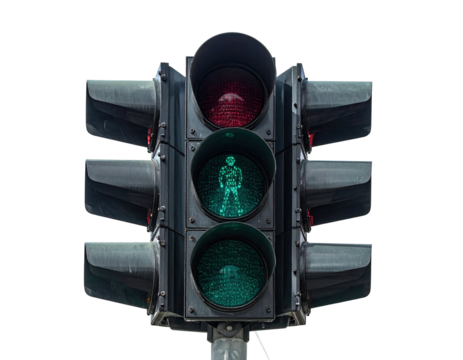 Close-up view of a traffic signal with red light on and pedestrian walk sign illuminated