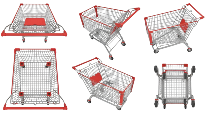 Side View of a Small Metal Shopping Trolley with Red Details shopping cart miniature isolated on a transparent background