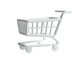 A metallic, three-dimensional rendering of a shopping cart, isolated on black