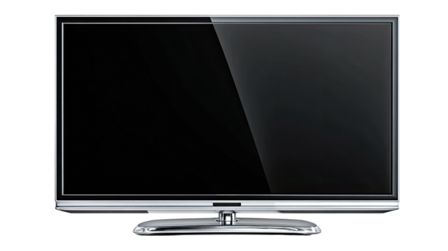 Sleek Television Display: A modern flat-screen television featuring a glossy black screen and sleek metallic trim offers a pristine viewing experience for entertainment and information.