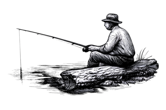 A fisherman rests on a log by the riverbank, holding a fishing rod in his hand.