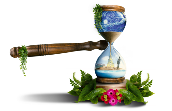 Mazo con con forma de reloj de arena que contiene una pintura de Vincent van Gogh e iconos más importantes de Cartagena