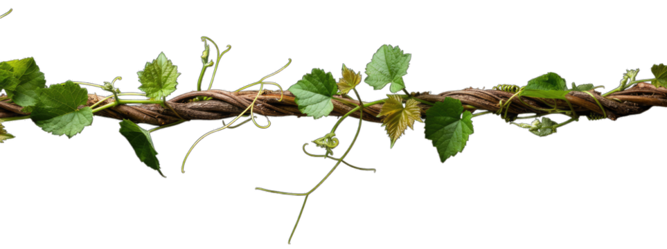 A twisting vine with lush green leaves composition on transparent background, PNG, design element, macro view close up Generative AI
