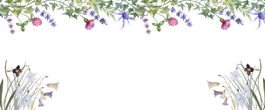 Delicate Botanical Frame Watercolor Garland  Whispy Corner Florals on Pure White on a transparent background