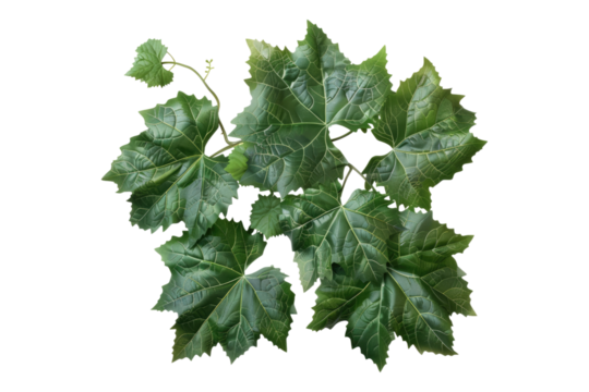 Grape branch with green leaves and tendrils on transparent, png. Grapevine. Sprig with leaves of grapevine