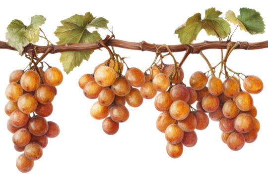 Beautifully rendered watercolor illustration of amber grapes hanging from a vine with green leaves on transparent background