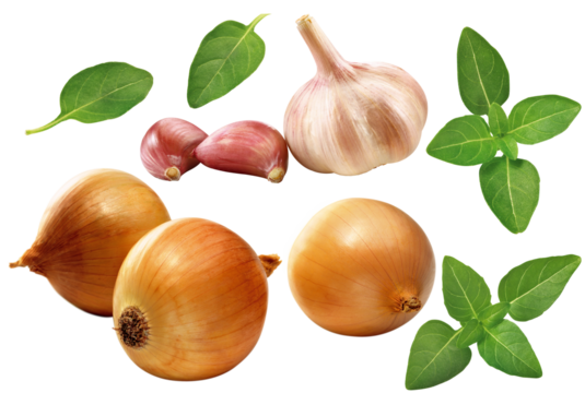 composição com cebola, alho e folhas de manjericão isolado em fundo transparente - temperos variados