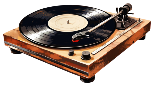 Vintage wooden turntable playing a vinyl record, isolated on transparent background