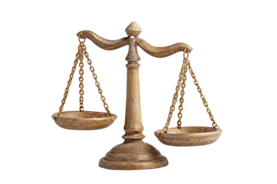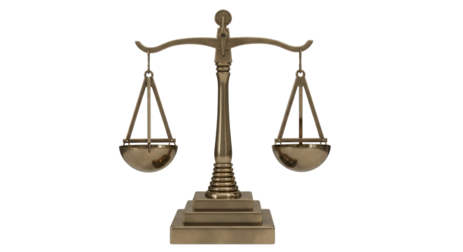 Golden justice scale on transparent background illustrating balance