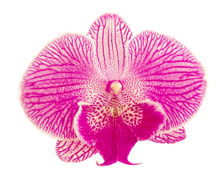 Stunning pair of vibrant magenta Cattleya orchid flowers in full bloom with yellow details, isolated on a clean clear white background