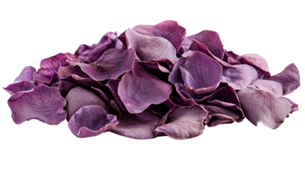 Pile of purple rose petals, floral close-up arrangement, cut out transparent