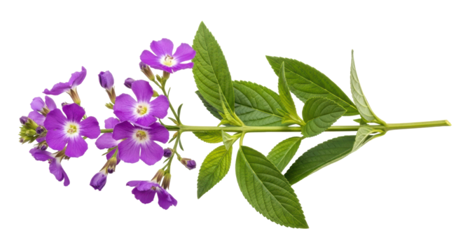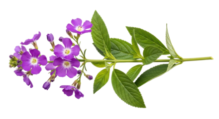 Isolated branch of flowering purple wildflower, delicate petal pattern and green leaves, bloom