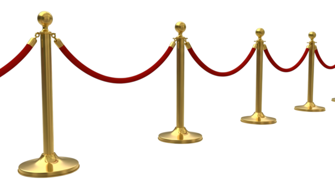 A red carpet with golden stanchions and velvet ropes on each side isolated on white or transparent background. PNG