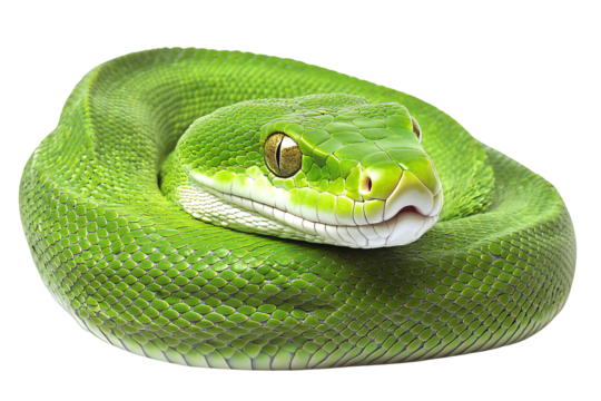 Emerald tree boa PNG isolated on transparent background, green snake with yellow markings, exotic pet for wildlife and nature designs
