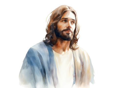 A serene watercolor painting of Jesus with a peaceful expression, featuring soft pastel hues and gentle brush strokes. Isolated on white background
