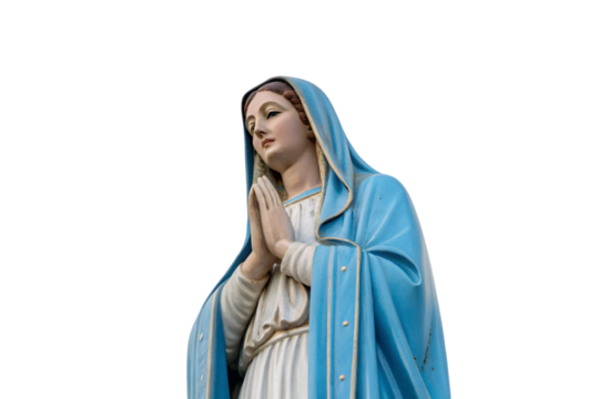 Graceful Virgin Mary statue in blue and white robes, hands folded prayerfully, eyes gazing heavenward, isolated on a transparent background