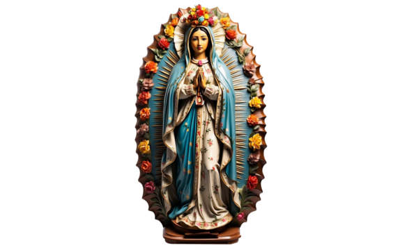 Virgin Mary statue in traditional white and blue robes with serene expression, isolated on a transparent background