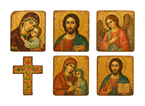 Christian religious icons and a cross are beautifully displayed in a traditional style, featuring depictions of Jesus, Mary, and an angel with golden halos.