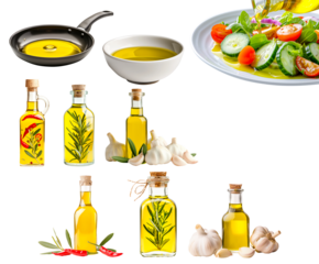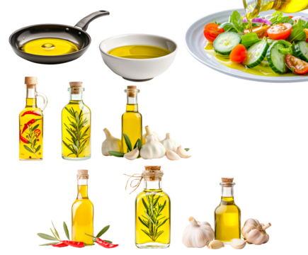 Olive oil in bottles with garlic, lemon, herbs, mushrooms, salad and pan, isolated on white background. Concept of healthy cooking.