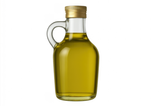 A clear glass bottle with vibrant golden-yellow extra virgin olive oil and a dark green screw cap, isolated against a seamless transparent background with copy space, concept for premium healthy